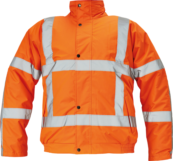 certifikováno dle RIS 3279 TOM pro použití na železnicích; hi-vis bunda s reflexními pruhy; kapuce integrovaná v límci; podlepené švy; reflexní pásky 3M