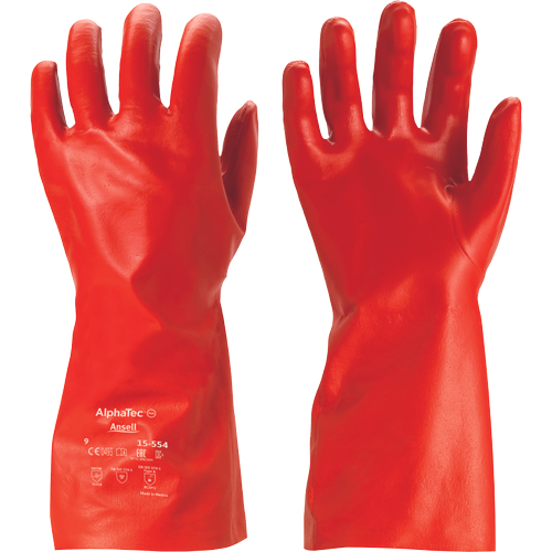 Červené rukavice šité z dvouvrstvého bavlněného úpletu, máčené v PVA, s odolností proti rozpouštědlům, vysokou mechanickou odolností, v celkové délce 35,5 cm. Nevhodné pro práci s vodou a vodními roztoky.