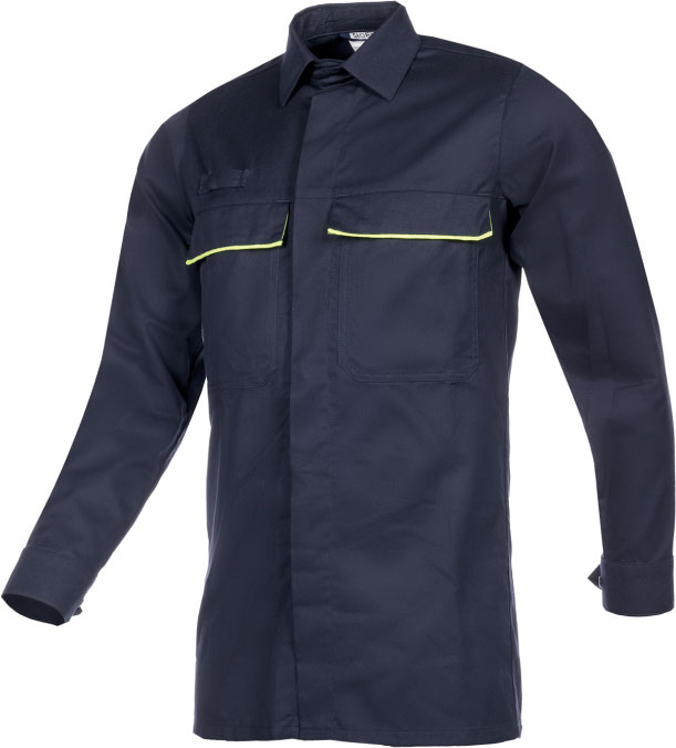 pánská košile s ochranou proti tepelnému účinku elektrického oblouku; antistatická; zapínání na druky pod krycí légou; lehký a prodyšný materiál s výbornou regulací odvodu vlhkosti; 2 náprsní kapsy s klopou, zapínáním na druky a kontrastním lemováním; spodní obvod rukávů nastavitelný pomocí druků.