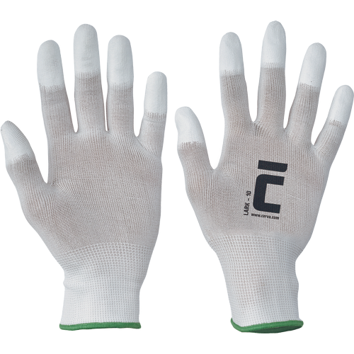 Pletené bezešvé nylonové rukavice, s tenkou vrstvou polyuretanu na špičkách prstů a pružnou manžetou.