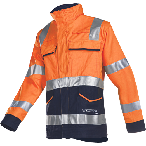 pánská pracovní bunda z lehké, přirozeně nehořlavé, prodyšné a poddajné látky; nabízí vynikající ochranu proti tepelným účinkům elektrického oblouku a ochranu proti teplu; dvojitě prošité reflexní FR proužky pro zvýšenou viditelnost; rovný límec; zapínání na zip pod klopou se skrytými druky; 2 našité náprsní kapsy s klopou zapínanou na skryté druky; 2 našité šikmé kapsy s klopou uzavřenou na skryté druky