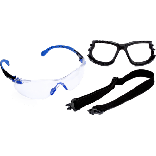 Modro-černé ochranné brýle s čirým polykarbonátovým zorníkem s povrchem 3M Scotchgard proti zamlžování, pěnová vložka, upínací pásek.