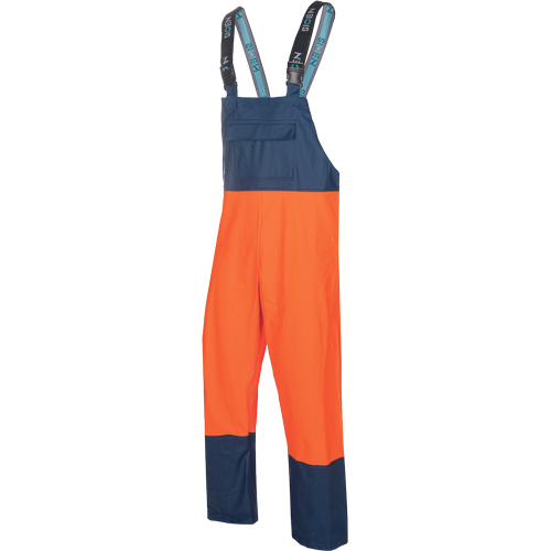 pánské nepromokavé kalhoty s laclem a elastickým pasem; 1 velká břišní kapsa; 2 boční kapsy; nastavitelné lacle.