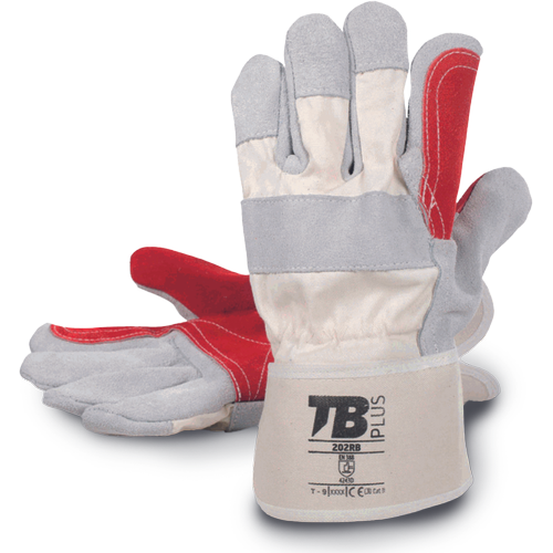 Rukavice z šedé hovězí štípenky. Bílá pogumovaná bezpečnostní manžeta. Výztuha z červené hovězí štípenky na dlani, palci a ukazováčku. Podšívka na dlani. Tloušťka: 1,1-1,3 mm.