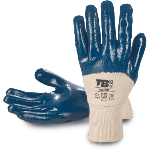 Rukavice bavlněnou vložkou. Modrý nitrilový 3/4 povlak. Pletené zápěstí.
