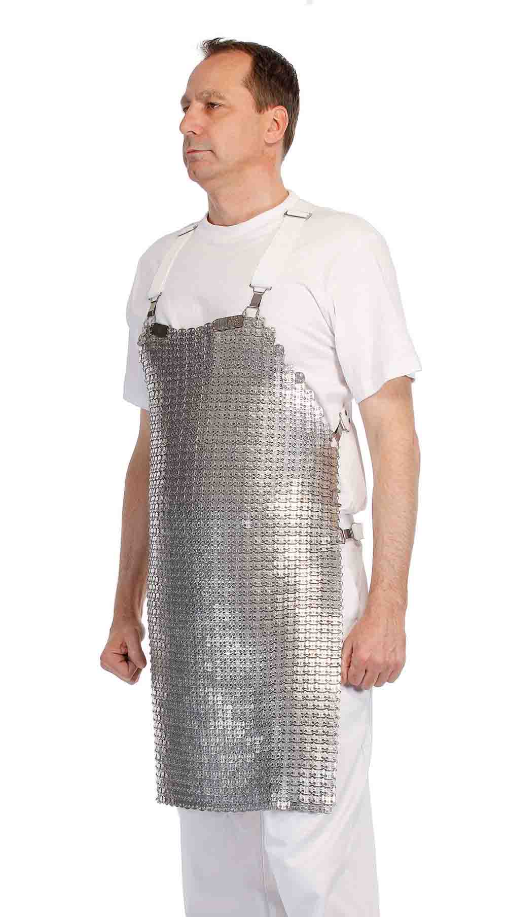 ochranná zástěra proti prořezu • ze zaoblených hliníkových destiček spojených nerezovými ocelovými kroužky z nerez oceli INOX • ochrana proti říznutí a bodnutí nožem