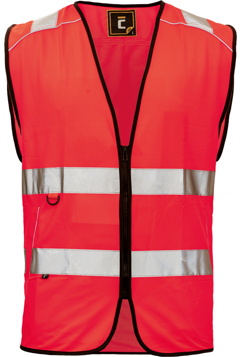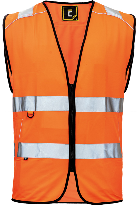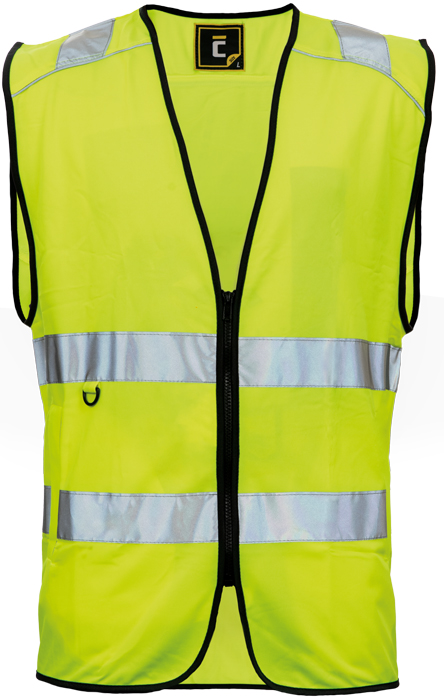 hi-vis vesta se 2 reflexními pruhy; kontrastní sedlo v oblasti ramen lemované reflexní paspulkou; zapínání na zip; 2 postranní lištové kapsy na zip