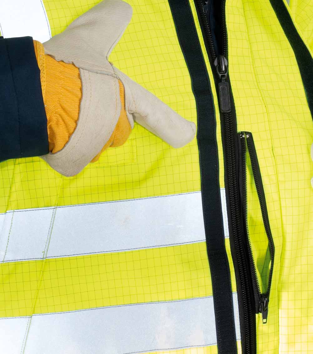 Antistatická, nehořlavá a chemicky odolná bunda s bavlněnou nehořlavou podšívkou, kapucí v límci a přelepenými švy.